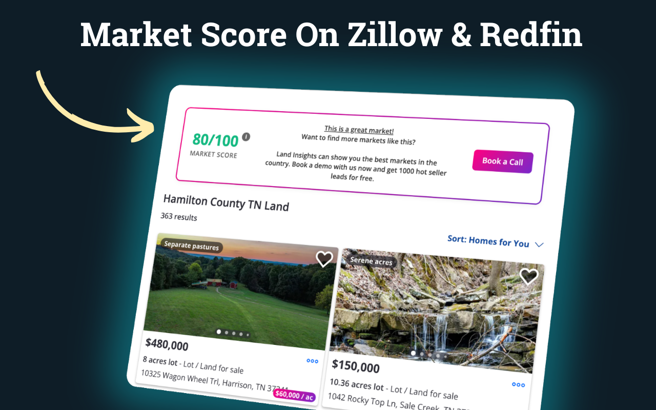 - Works everywhere you browse — Redfin, Zillow, Land.com, and more.
