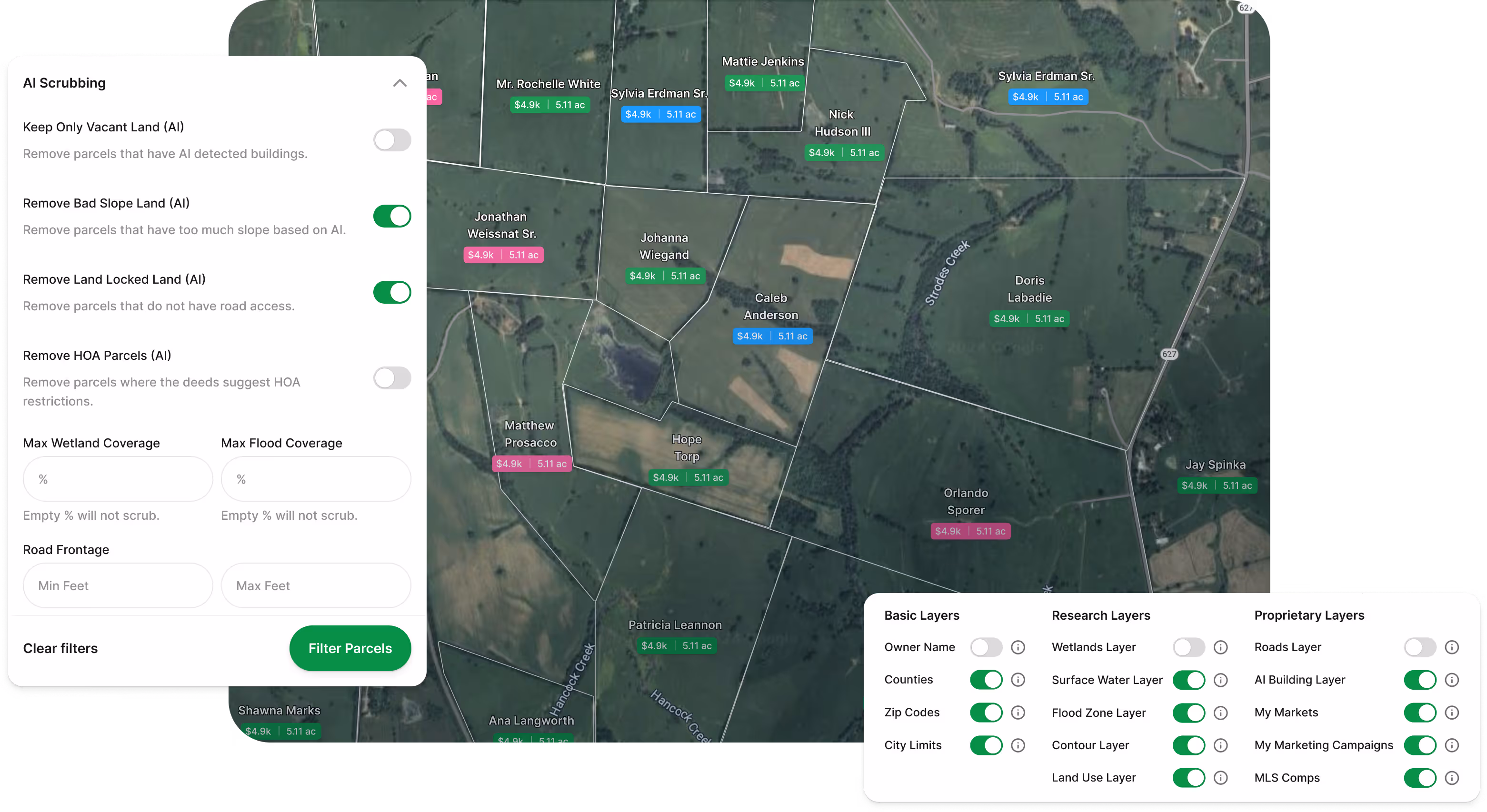 AI Scrubbing Filters automatically detect and remove “bad” parcels such as landlocked lots, wetlands, steep slopes, or properties without road frontage, completely free. You can also apply manual filters to fine-tune your list based on your exact deal criteria.